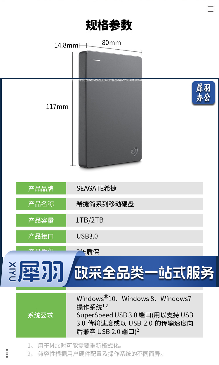 希捷(SEAGATE)2TB 简系列 移动硬盘 USB 3.0兼容MAC PS4 f69