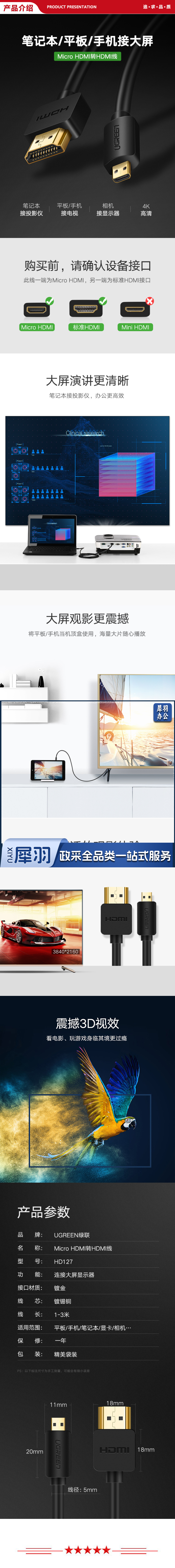 绿联30102 Micro HDMI转HDMI转接线 HD127 HDMI2.0版 4K高清转换线 1.5米