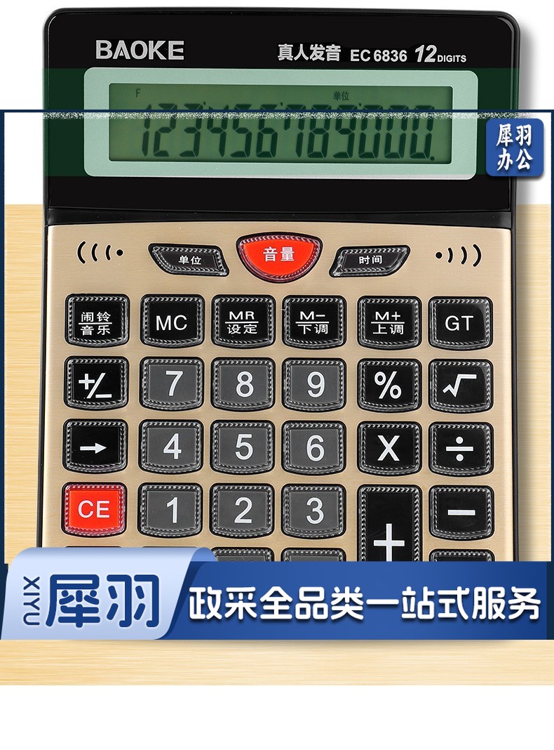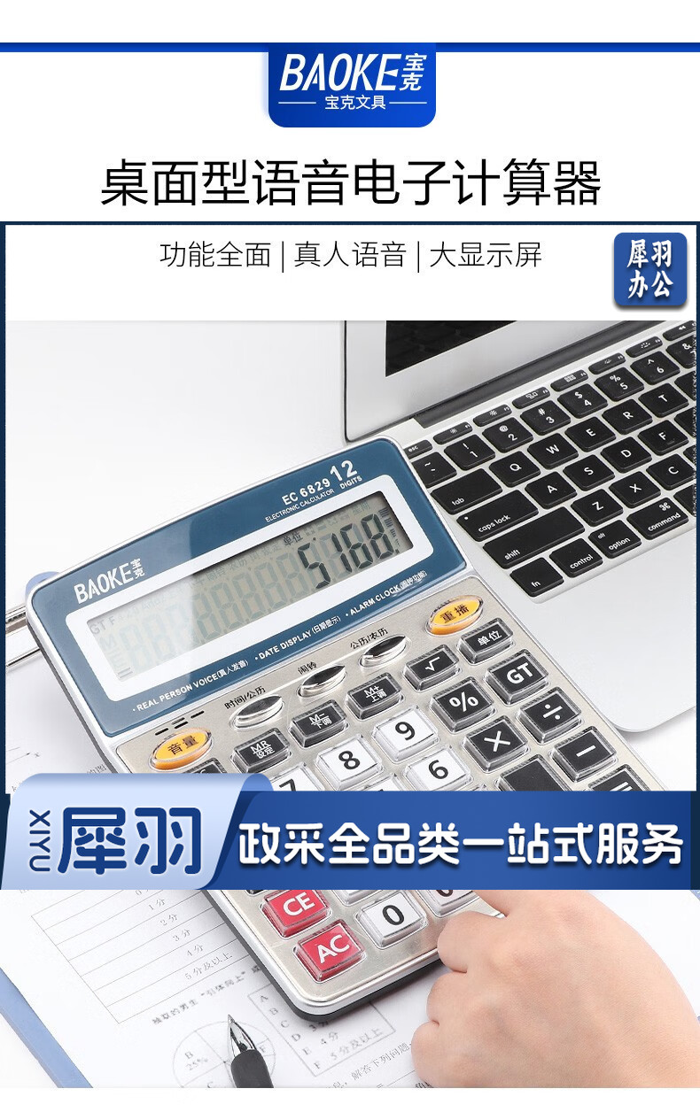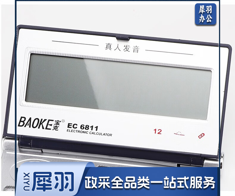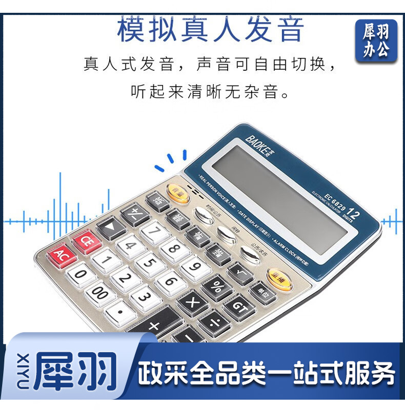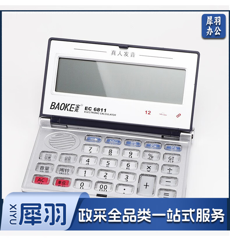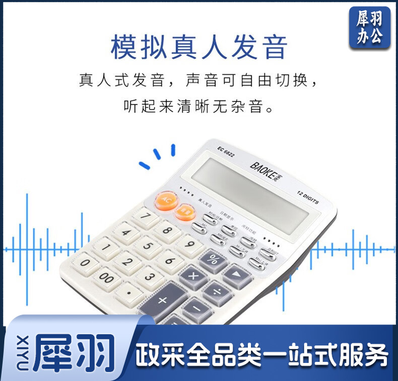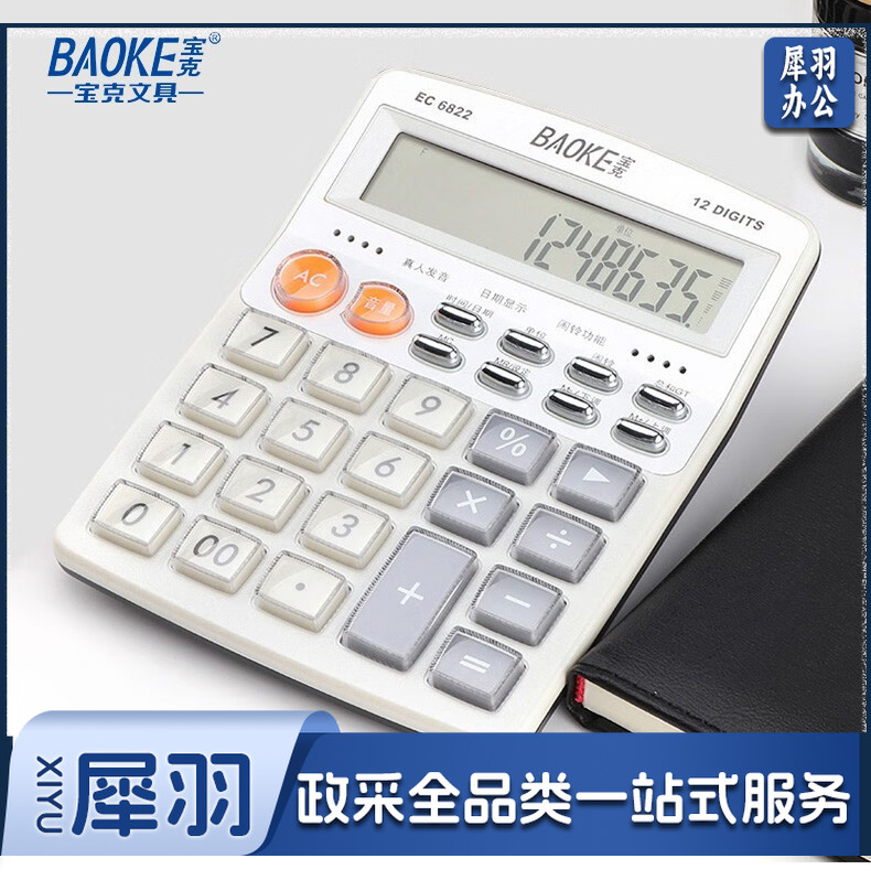 宝克(BAOKE) 语音计算机 12位带闹铃语音计算器 学生 财务 桌面办公计算机 办公用品 文具 透明按键 小巧精致 哑光白 EC6822