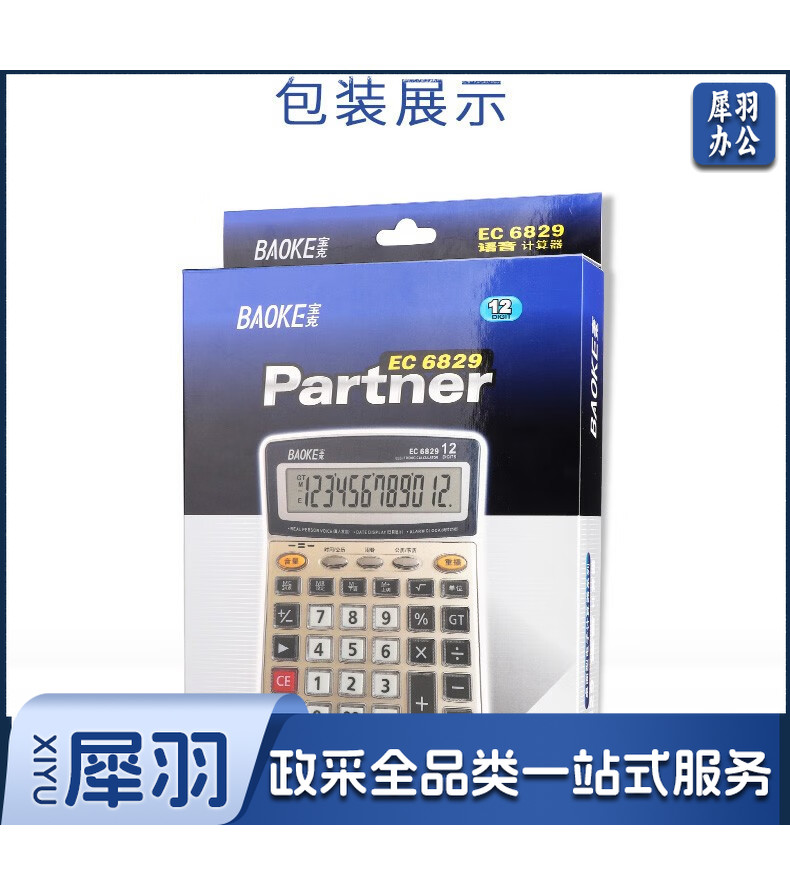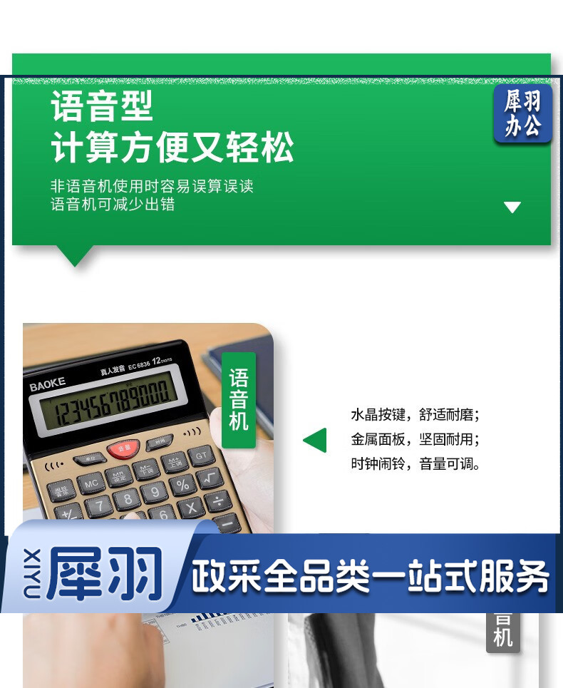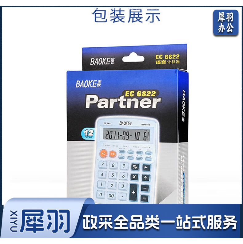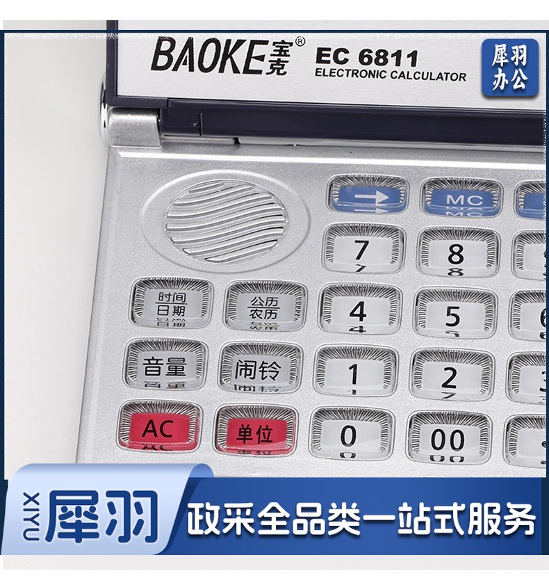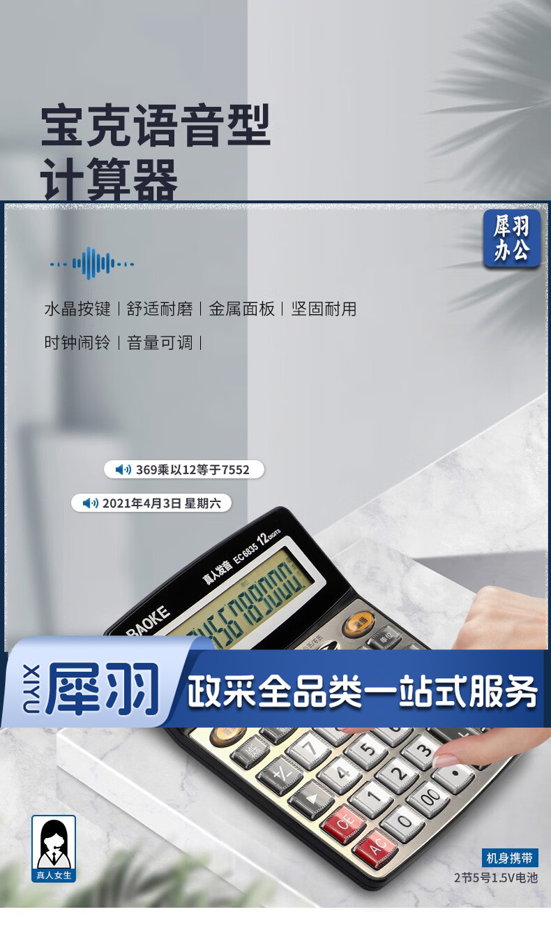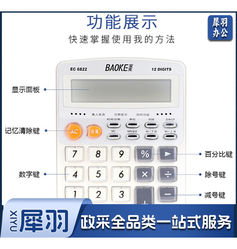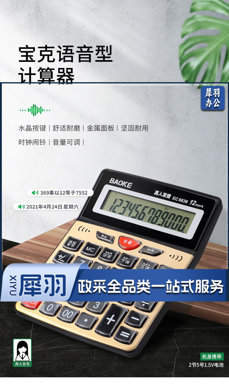 宝克(BAOKE) 语音计算机 12位带闹铃语音计算器 学生 财务 桌面办公计算机 办公用品 文具 透明按键 小巧精致 哑光白 EC6822