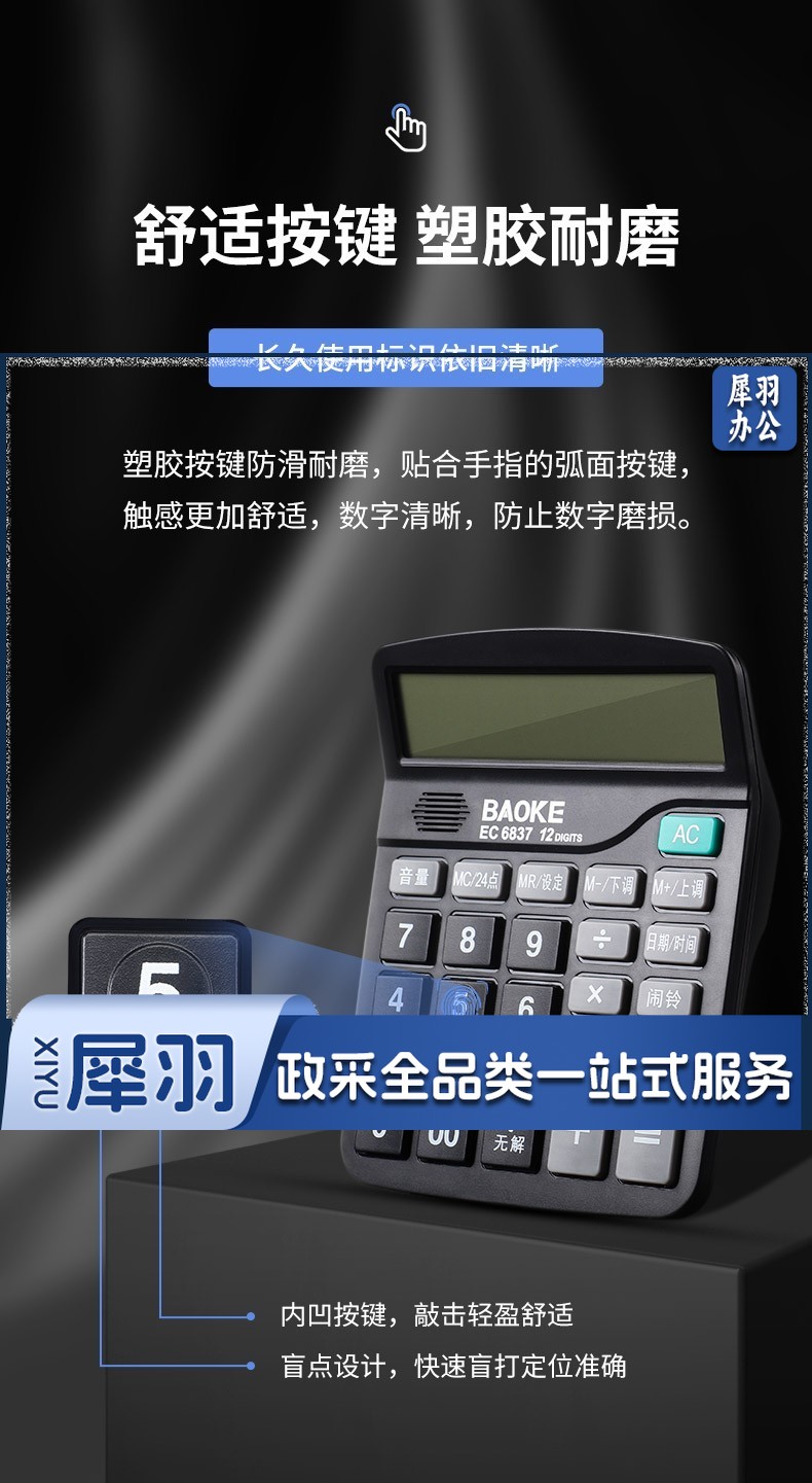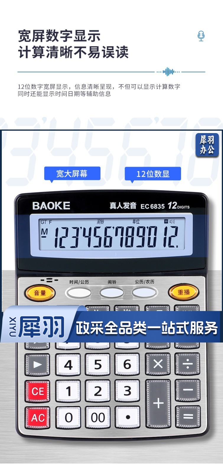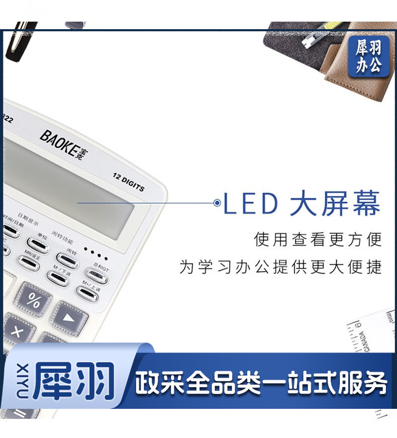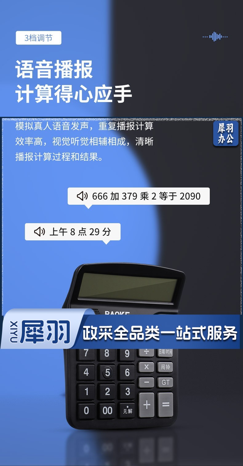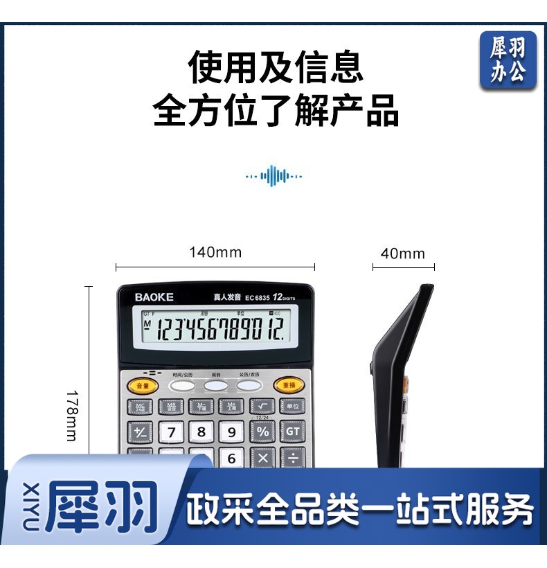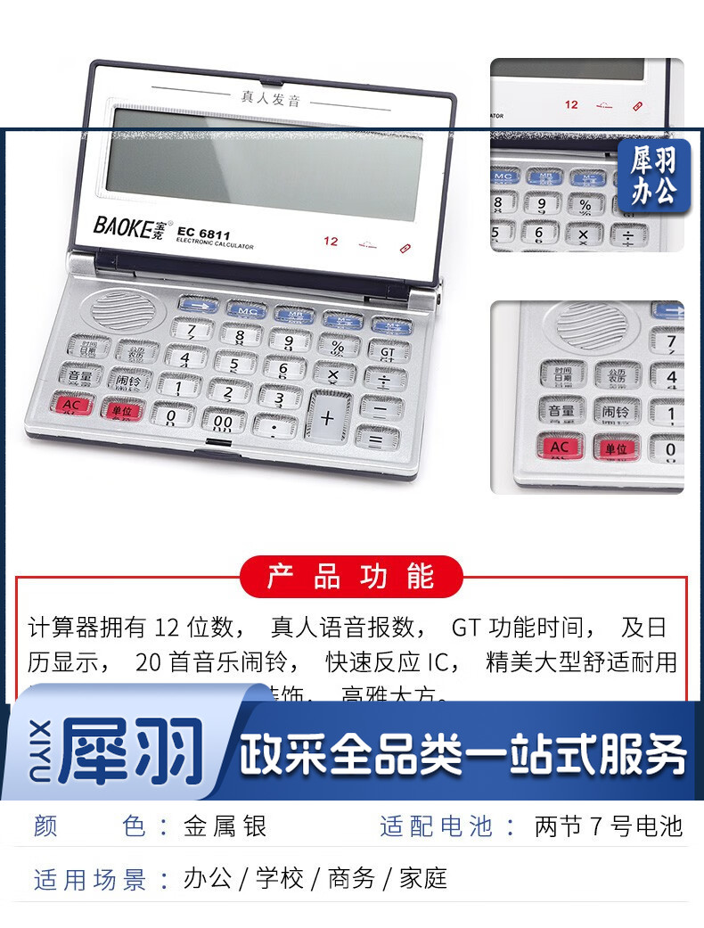 宝克(BAOKE) 语音计算机 12位带闹铃语音计算器 学生 财务 桌面办公计算机 办公用品 文具 透明按键 小巧精致 哑光白 EC6822