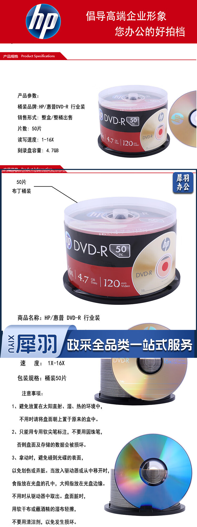惠普(HP) DVD-R 光盘/刻录盘 空白光盘 16速4.7GB 桶装50片 台产
