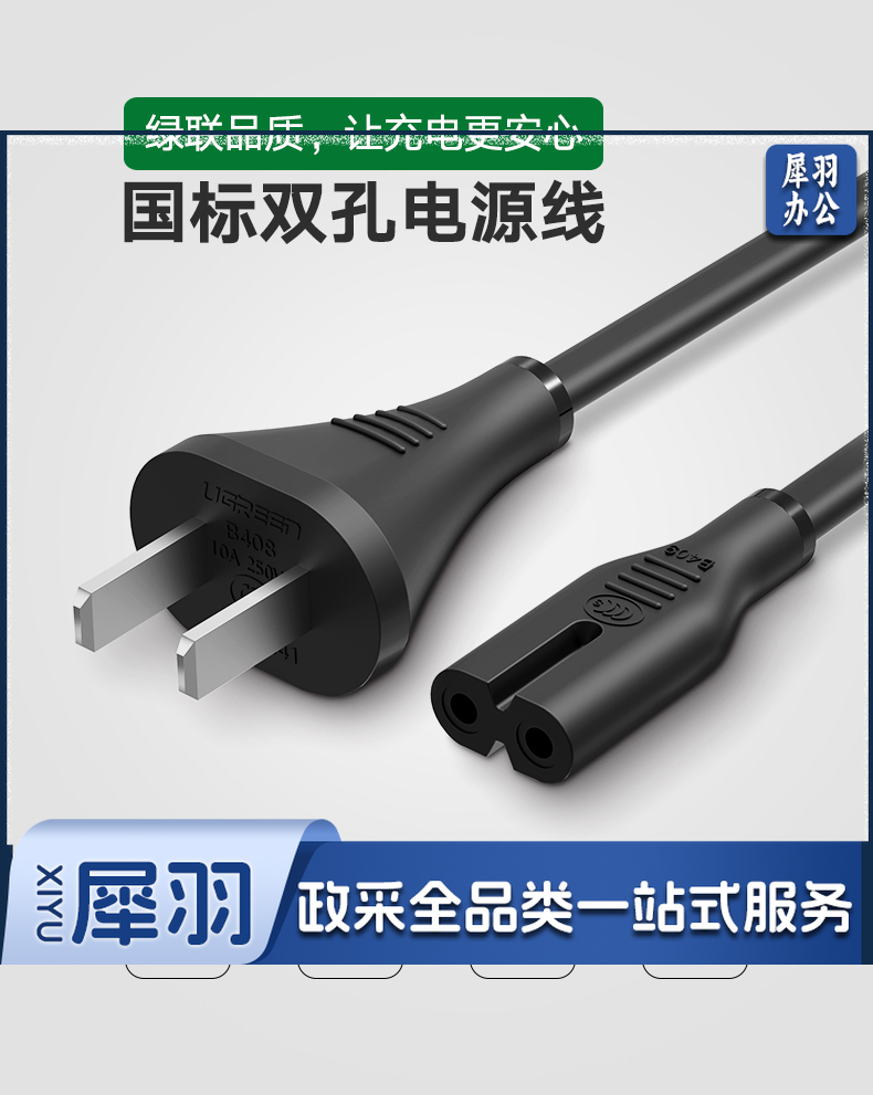 绿联/UGREEN 40311国标两插8字电源连接线 八字尾双孔 适用PS4/5/mac mini/打印机/数码相机/台灯/音响电源线 0.5米