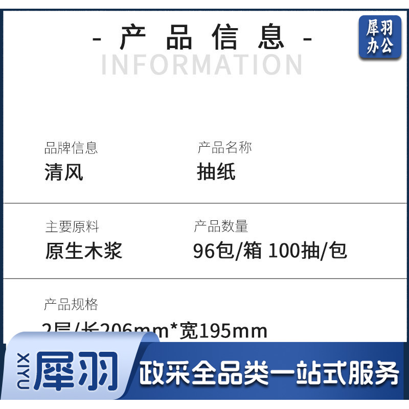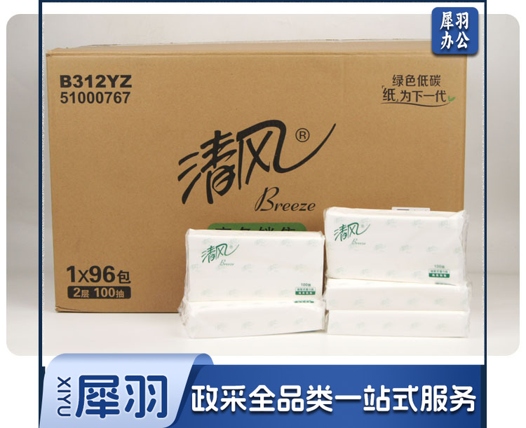 清风 抽纸整箱 加长家用商务大号餐巾纸 100抽/包 96包/箱 B312YZ