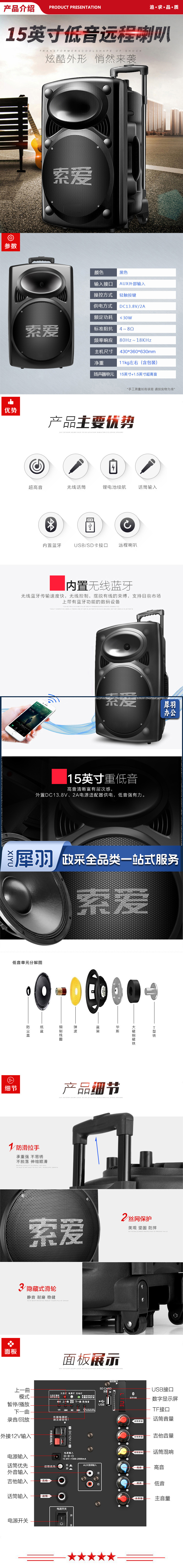 索爱(soaiy)A90 15英寸大功率重低音广场舞音响+双话筒