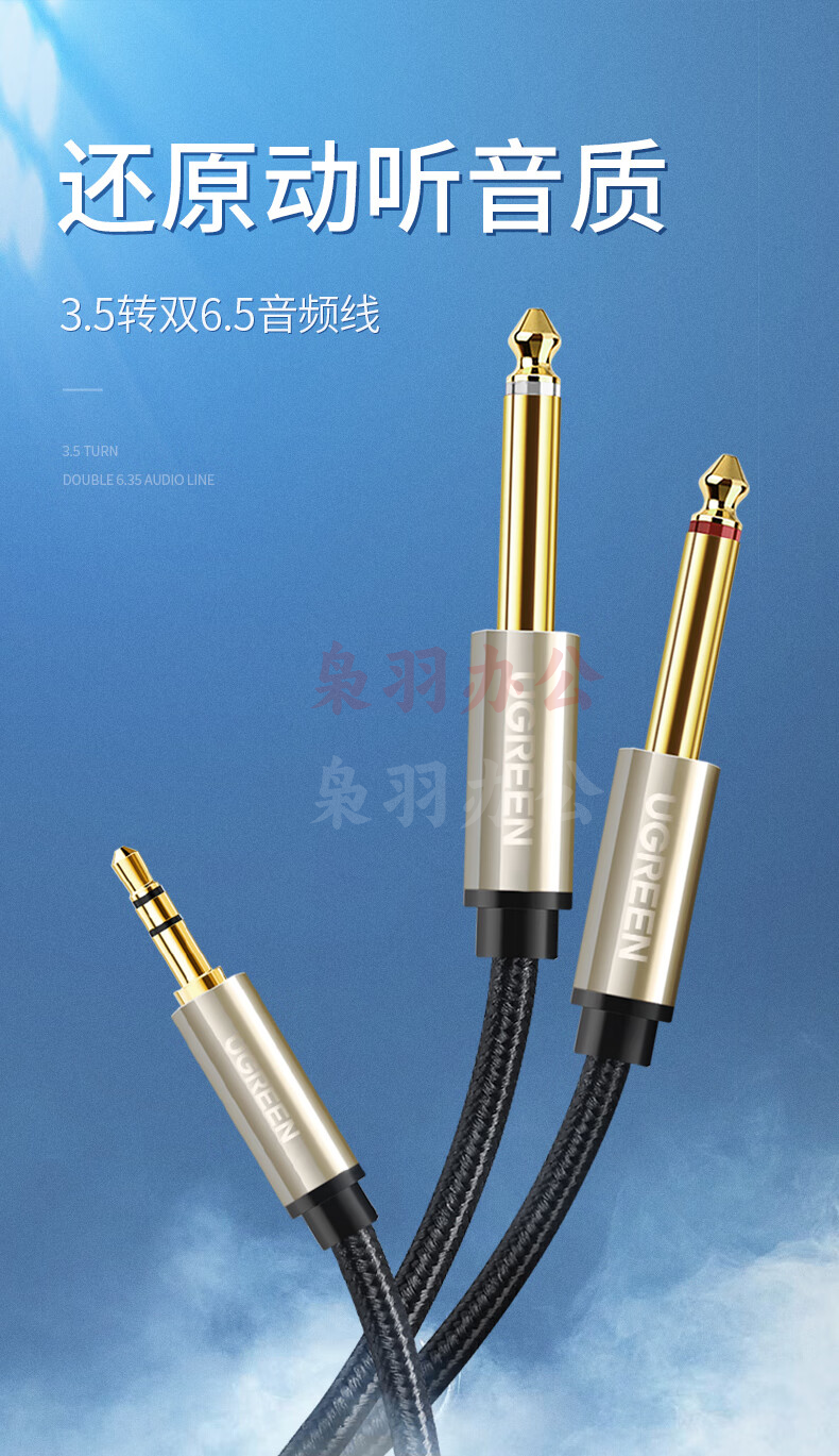 绿联40792 3.5mm转双6.5mm一分二音频线 6.35大二芯立体声转接线手机笔记本电脑调音台音响箱连接线 棉网编织 2米