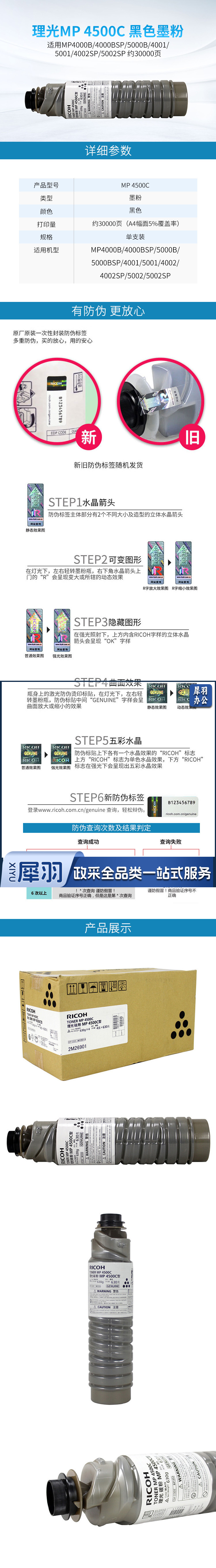 理光(Ricoh)MP 4500C 墨粉 黑色单支装 适用MP4000B/4000BSP/5000B/4001/5001/4002SP/5002SP 约30000页