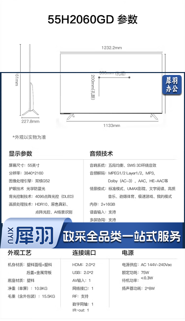 长虹 CHANGHONG 55H2060GD 55英寸4K超高清安卓智能商用电视