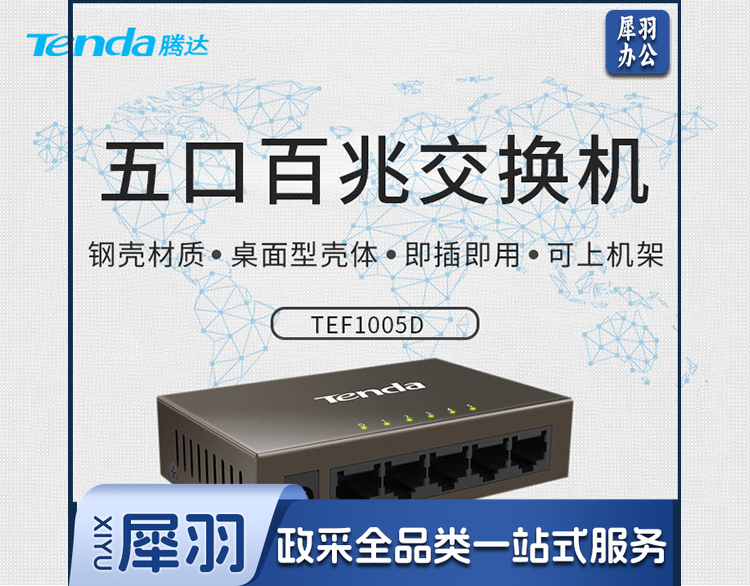 腾达(Tenda)TEF1005D 5口百兆铁壳网络交换机 4口监控工程 家用宿舍专用分线器