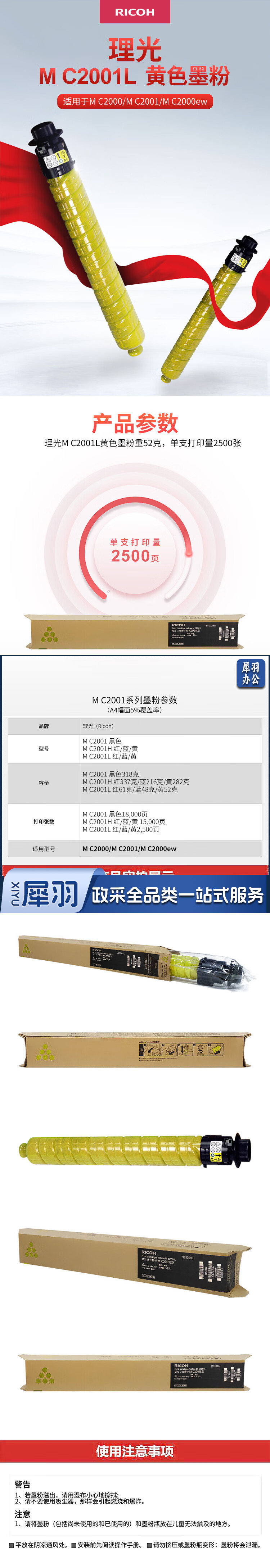 理光(Ricoh)M C2001L 黄色墨粉盒 适用于M C2000/M C2001/M C2000ew