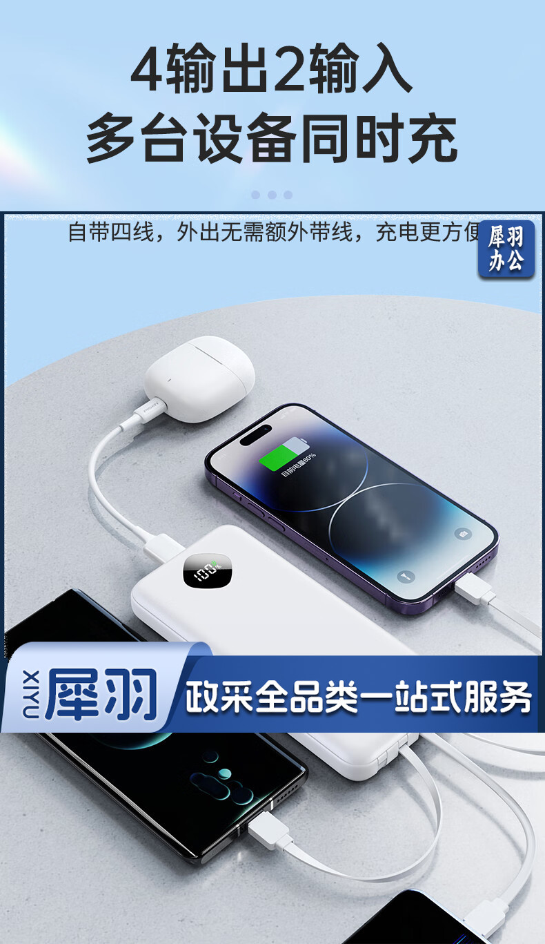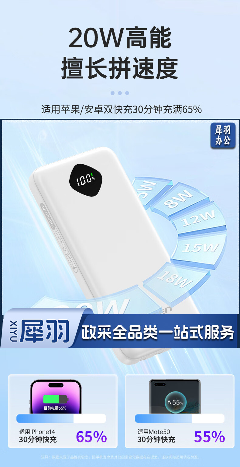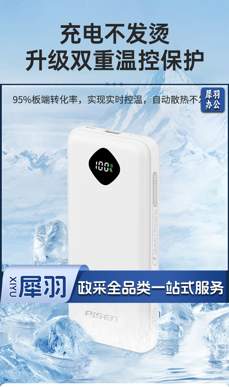 品胜 充电宝自带四线20W快充大容量可上飞机轻薄便携小巧移动电源10000mAh适用苹果华为小米手机 简约白【自带四线 双向快充】