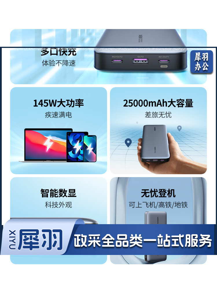 绿联 145W笔记本充电宝快充 25000毫安时大容量移动应急备用户外电源 通用PD100W大功率