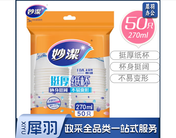 妙洁一次性纸杯 挺厚纸杯 270ml 大杯 50只装 MDCA50-B