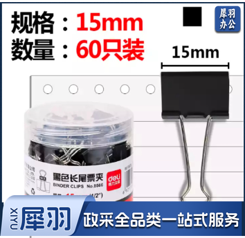 得力/deli 8566-6#黑色长尾票夹15mm筒装(黑)(60只/筒)