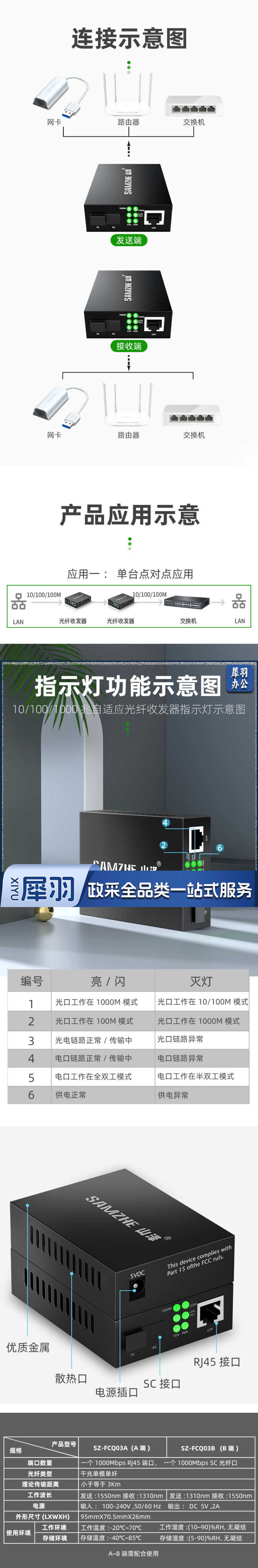 山泽(SAMZHE)电信级光纤收发器单模单纤光电转换器网络监控SC接口千兆自适应3KM 一对 SZ-FCQ03AB