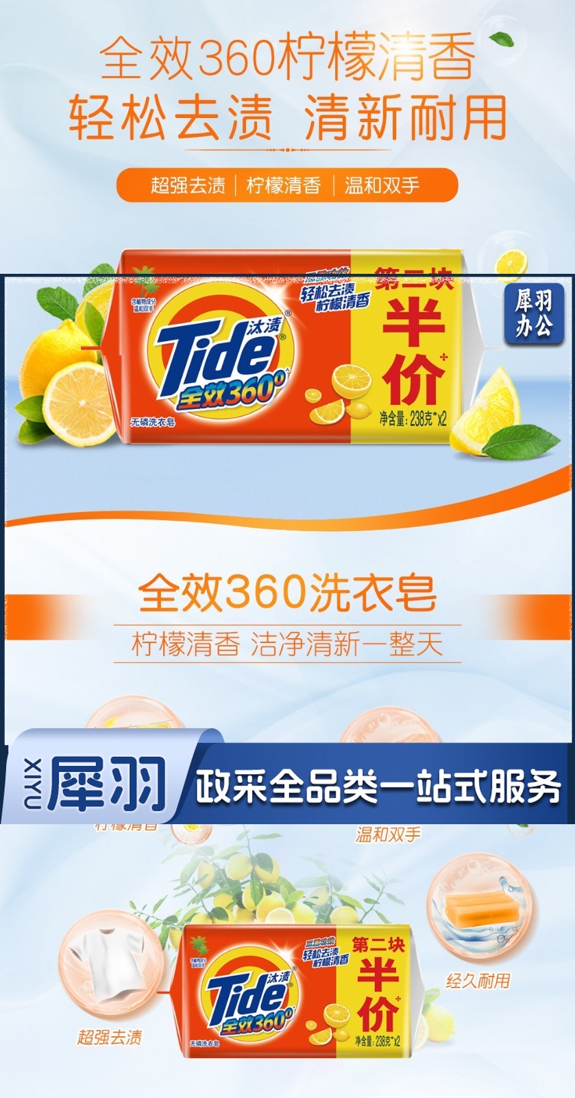 汰渍全效三重功效柠檬洗衣皂增白皂单块多块组合装 238g*2块加量装 强效去污去渍持久清香洗衣皂 全效洗衣皂238g*2块