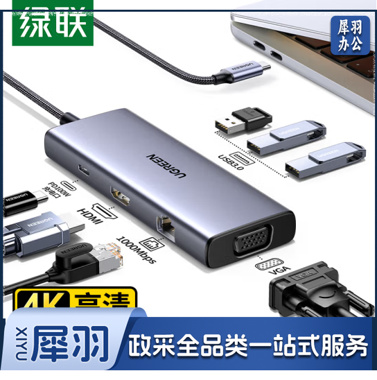 绿联15599 Type-C扩展坞 千兆网线转接口USB网卡拓展坞读卡器HDMI/VAG转C口 通用笔记本电脑扩展器