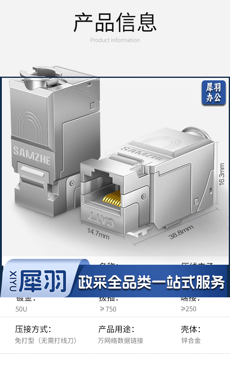 山泽(SAMZHE)七类网络模块 CAT7网线插座面板屏蔽免打模块 RJ45水晶头母座电脑网线连接头 锌合金款 MK007