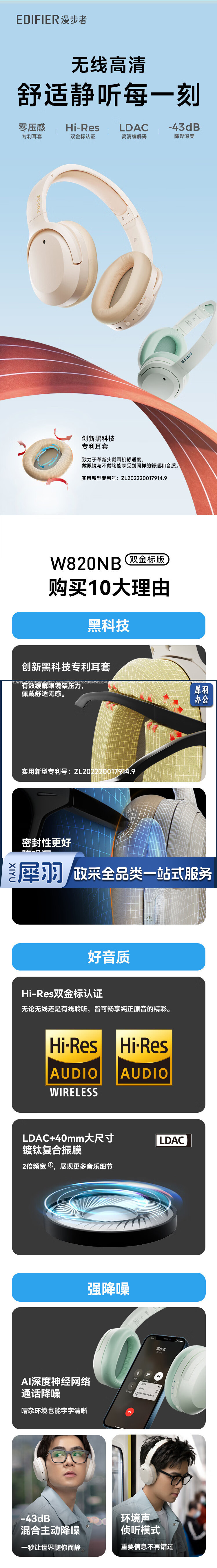漫步者(EDIFIER)W820NB双金标版 头戴式主动降噪蓝牙耳机 典雅灰