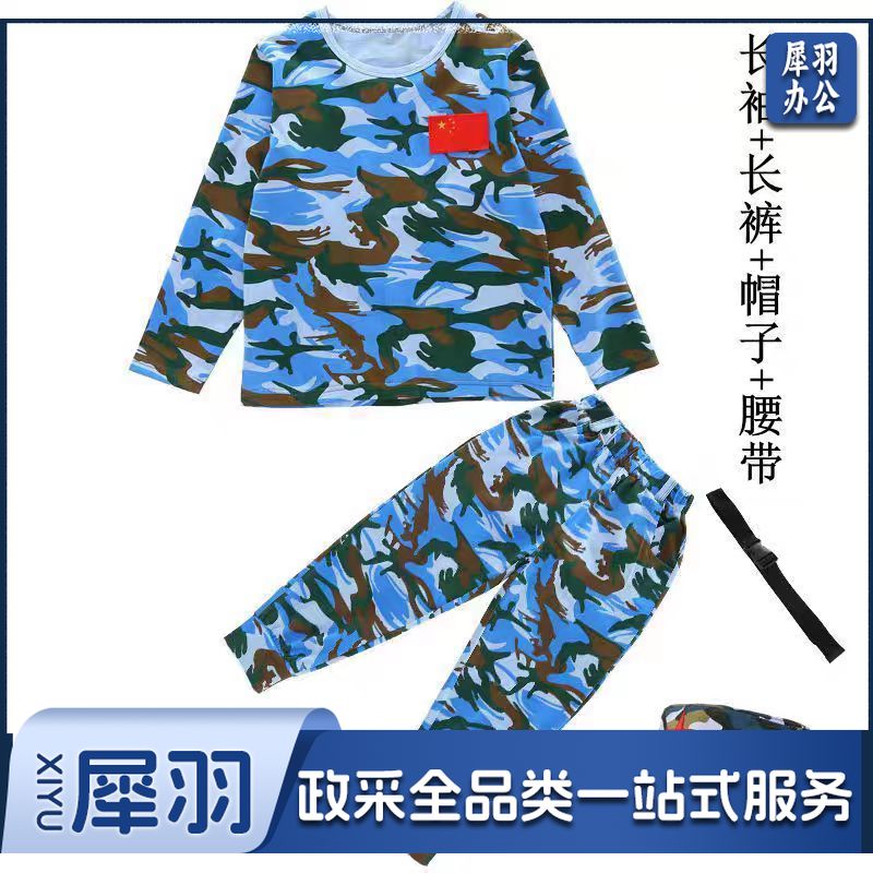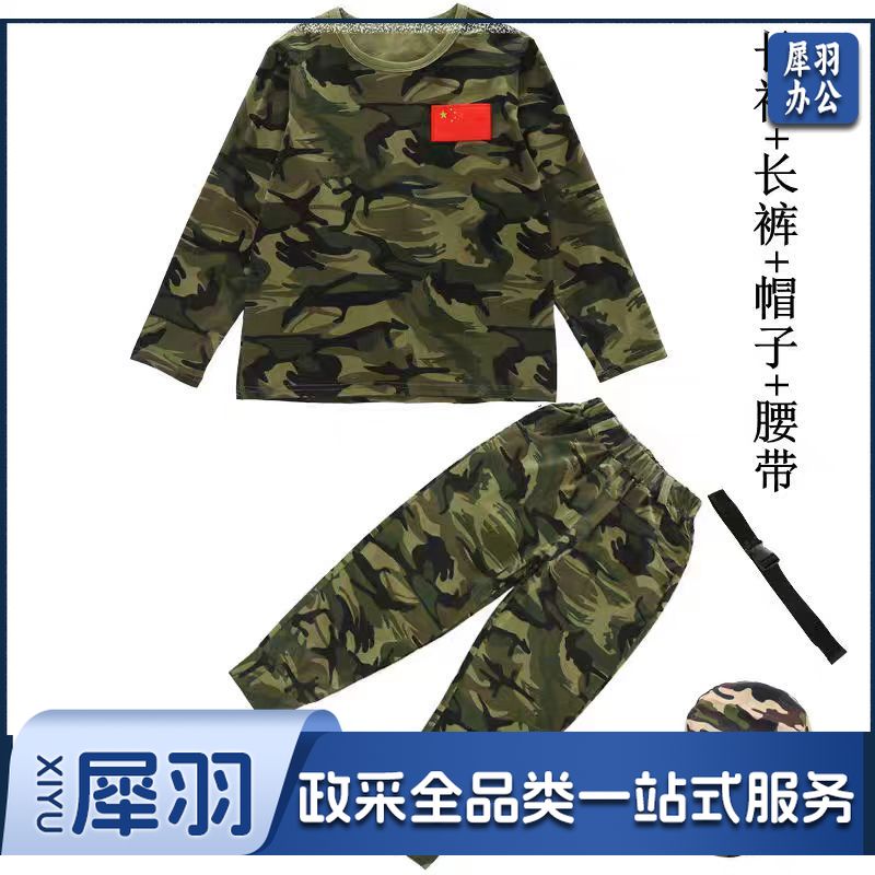 儿童迷彩服套装长袖T恤小学生幼儿园演出服研学夏令营服装军训服套装+帽子+腰带(100-180cm可选)