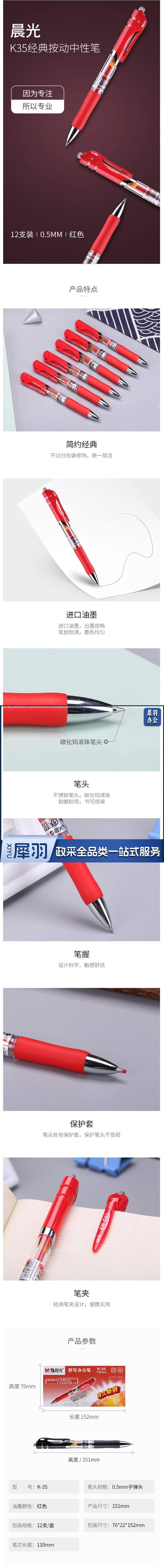 晨光 红色中性笔 K35/0.5mm 经典按动子弹头签字笔
