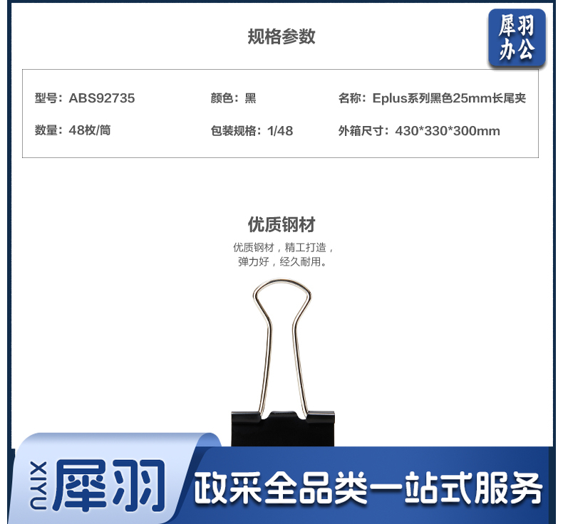 晨光 ABS92735长尾夹 25mm 48枚/筒 黑色
