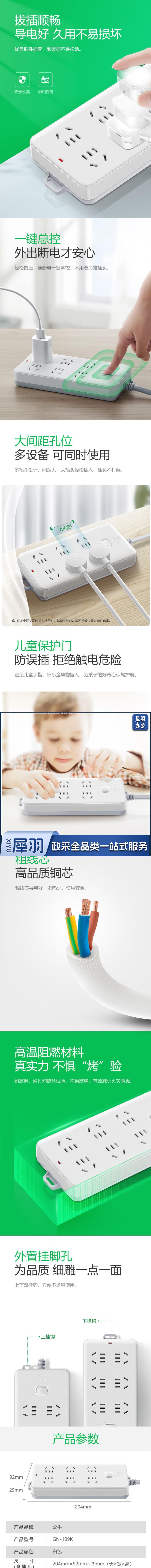 公牛 GN-109K 6位总控1.8米多位插座移动插排多位插座排插接线板