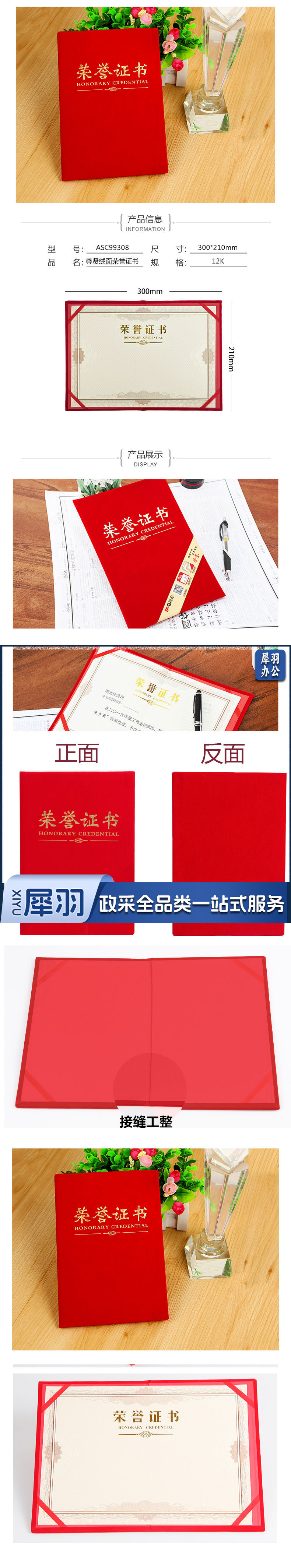 晨光 12K荣誉证书 尊贤绒面荣誉证书单本装含芯 229mm*160mm ASC99308