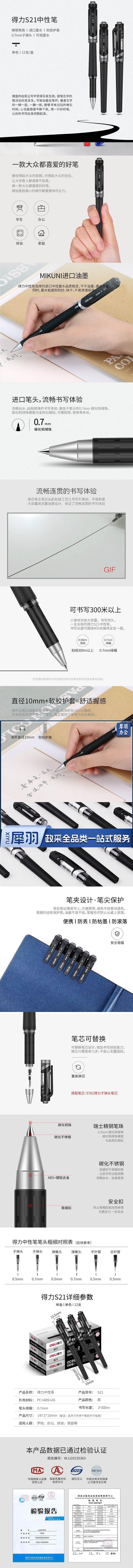 1100703872EA 得力 S21 中性笔0.7mm子弹头(黑) 12支/盒