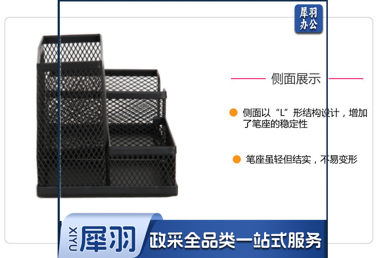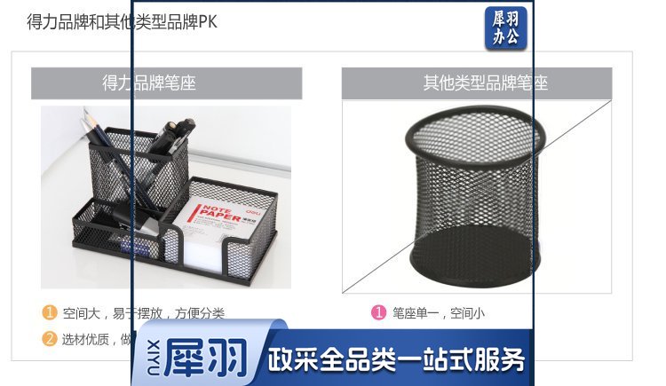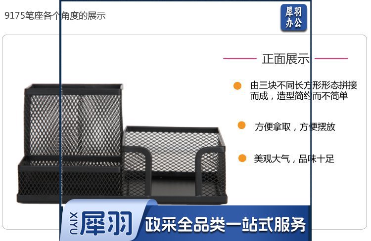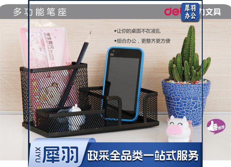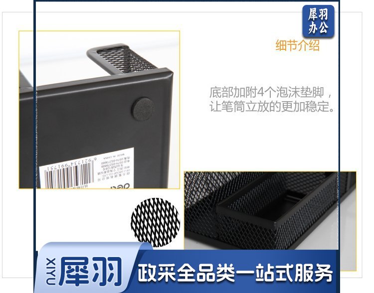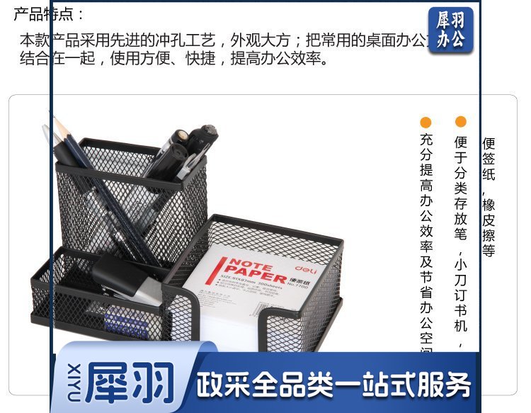 本款产品采用先进的冲孔工艺,外观大方;把常用的桌面办公文具结合在一起,使用方便、快捷,提高办公效率。