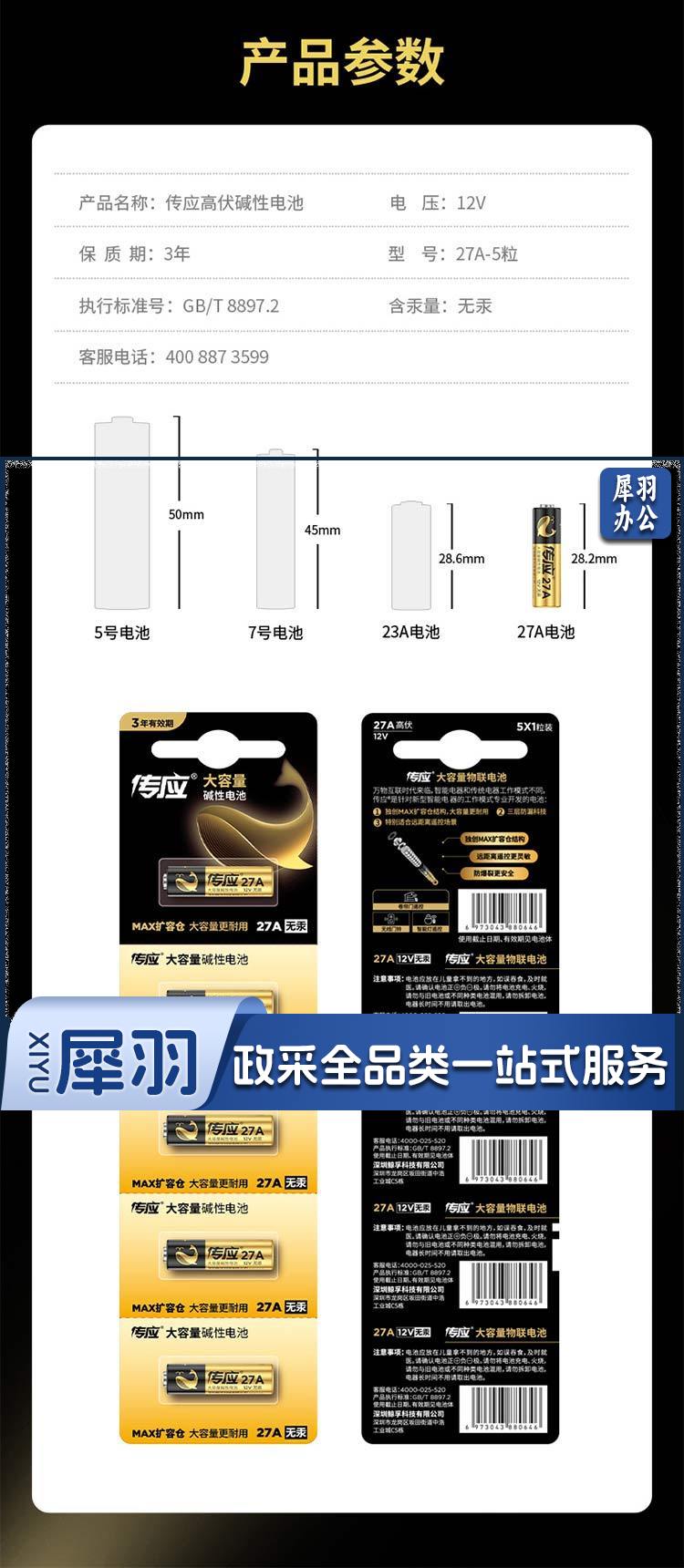 南孚传应(NECTIUM) 27A12V电池5粒 物联高伏碱性电池 适用门禁门铃遥控器车辆防盗器电动卷帘门等27a