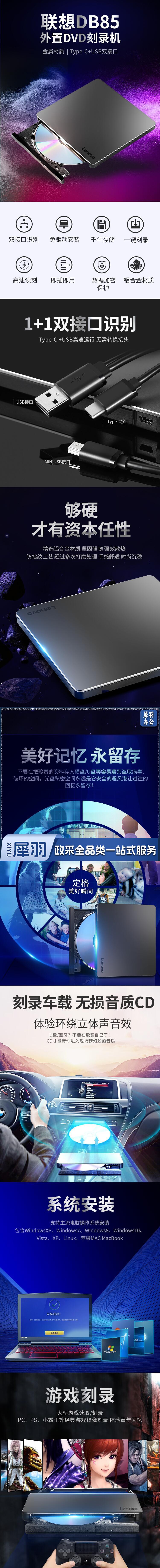 联想(Lenovo)8倍速 铝合金材质 Type-C/USB接口 外置光驱 DVD刻录机 移动光驱 移动刻录机 (Windows/苹果系统/DB85)