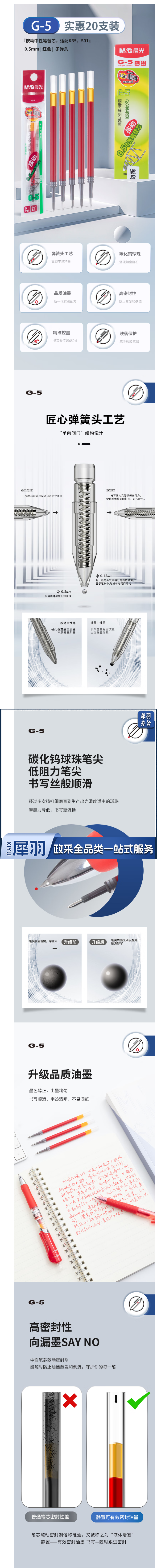 晨光 G-5中性笔芯 0.5mm替芯水笔芯K35/S01/S08 20支/盒 红色(单位:盒)(2盒起售)