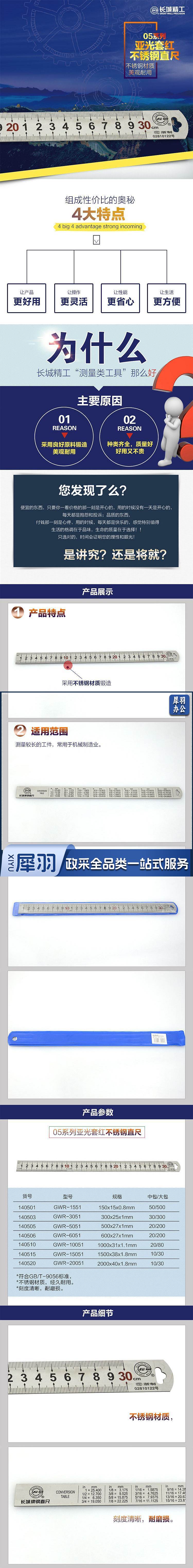 长城精工14050305系列亚光套红不锈钢直尺300*25*1mm(把)