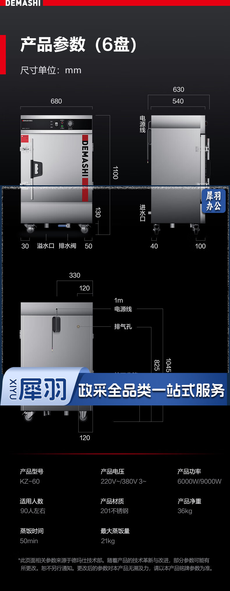 德玛仕(DEMASHI)蒸饭柜商用 蒸饭车蒸箱商用蒸饭箱蒸饭机蒸箱食堂单位学校防干烧蒸柜上置定时款220V KZ-60
