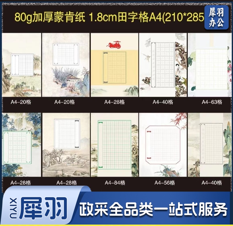80g蒙肯纸田字格 硬笔书法练习纸 10款混合装 货号:JC