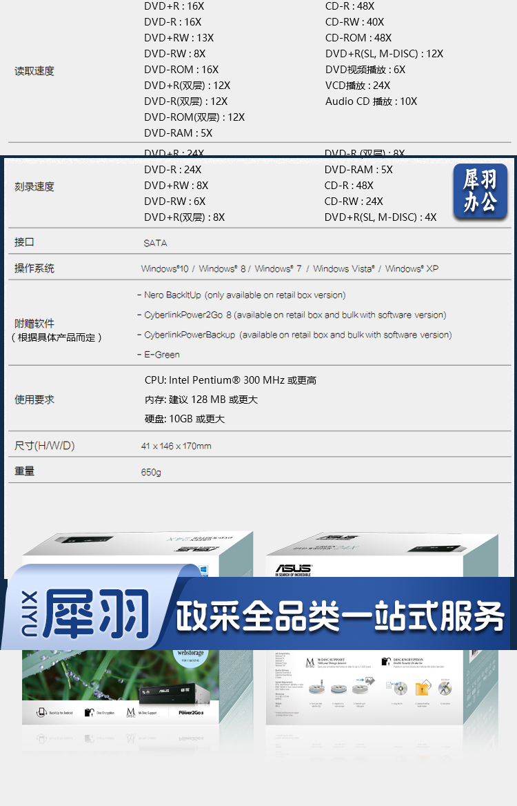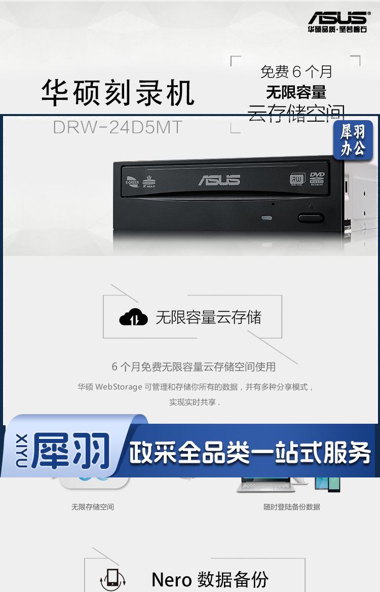 华硕24倍速 SATA接口 内置DVD刻录机 台式机光驱 黑色(DRW-24D5MT)