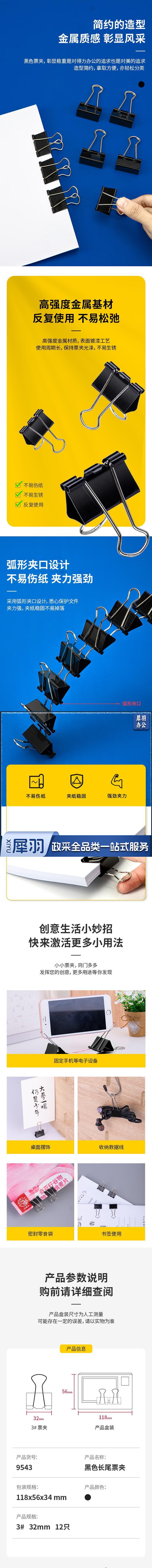 得力9543 32mm金属黑色长尾夹/票据夹/燕尾夹/铁夹子 12只/盒