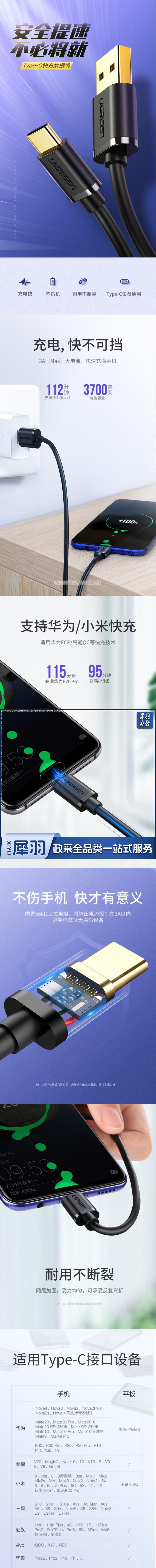 绿联 USB3.0转Type-C数据线 3A 1米 黑色 货号:WY