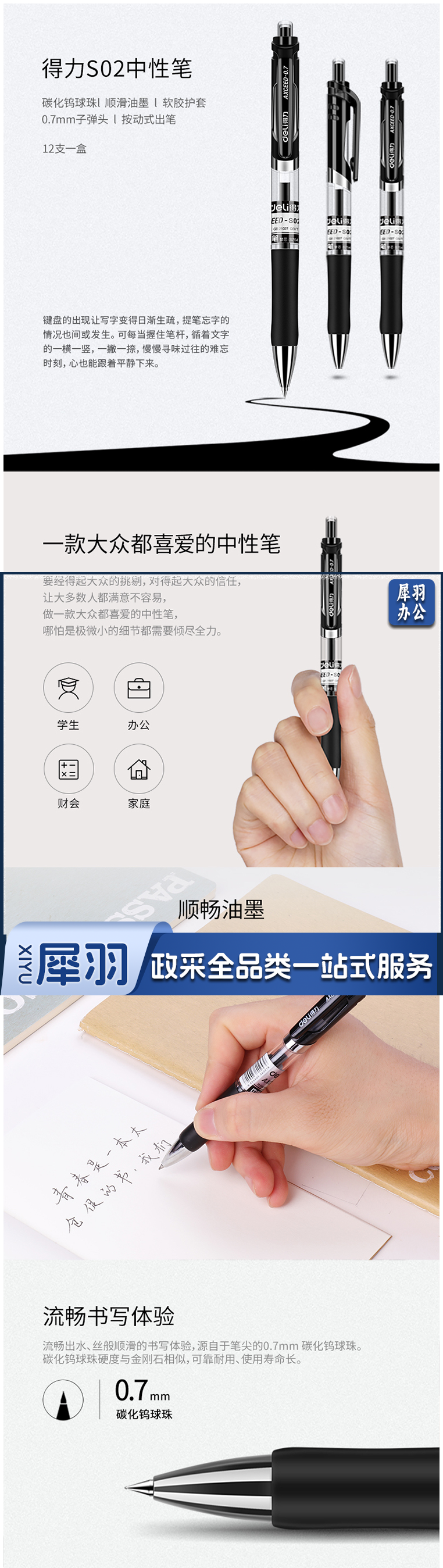 得力(deli) S02 0.7mm按动中性笔水笔签字笔 黑色 12支/盒