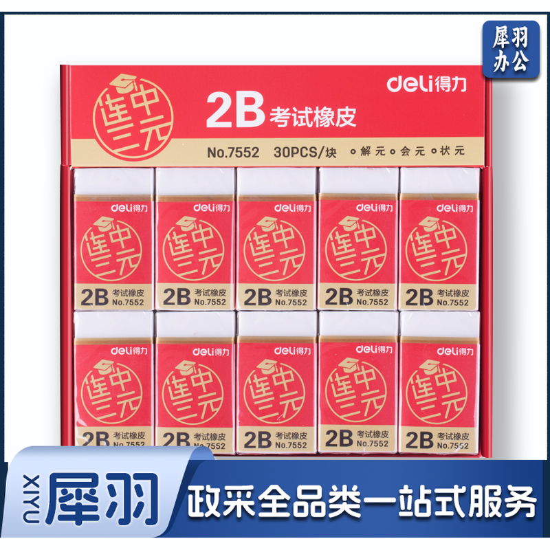 得力(deli)30块连中三元系列学生2B白色中考高考考试橡皮擦 7552