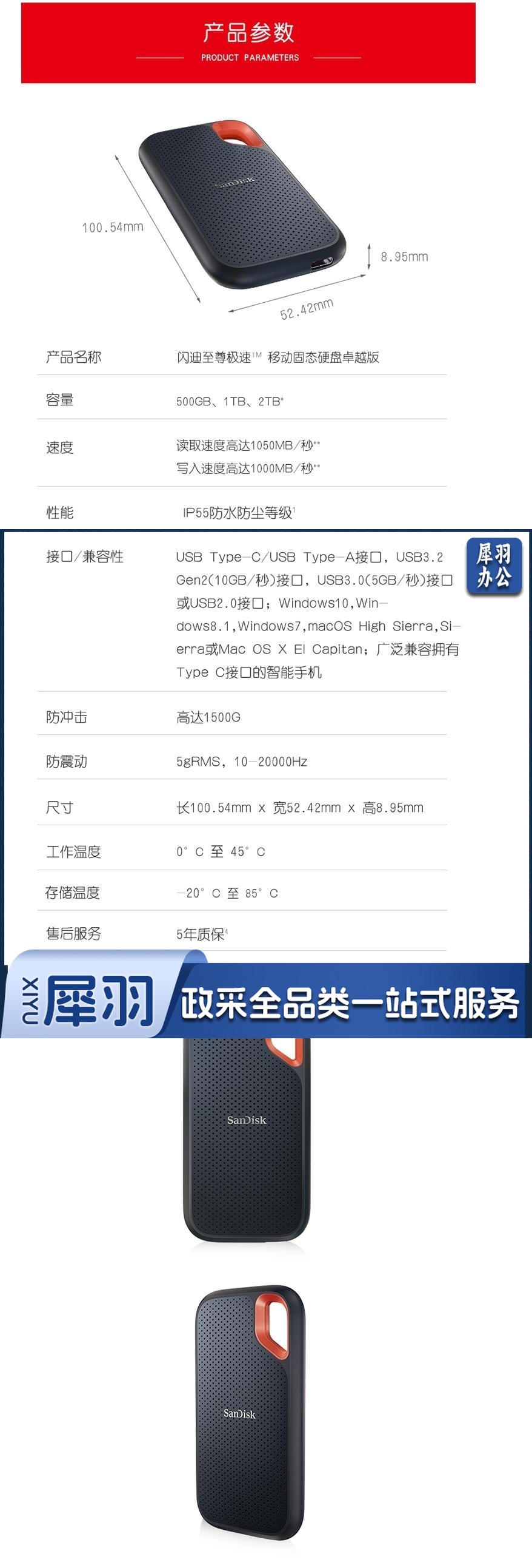 闪迪(SanDisk)1TB E61移动硬盘 传输速度1050MB/s IP55等级三防保护