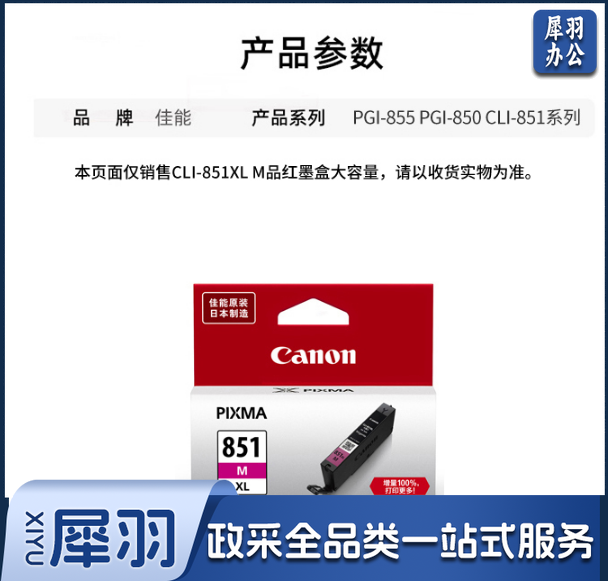 佳能(Canon)CLI-851XL M 大容量品红色(适用iX6880/iX6780/iP8780)单位:支