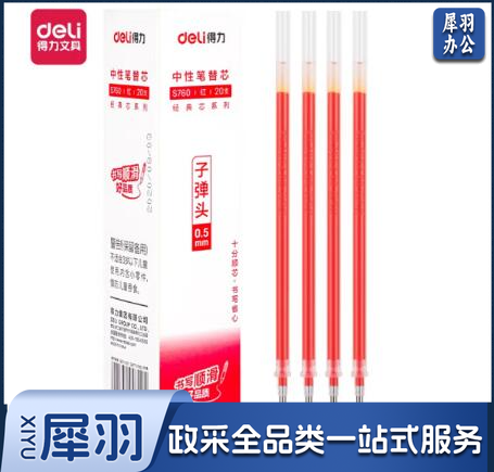 得力S760子弹头中性笔芯0.5mm(红) 20支/盒 单位:盒