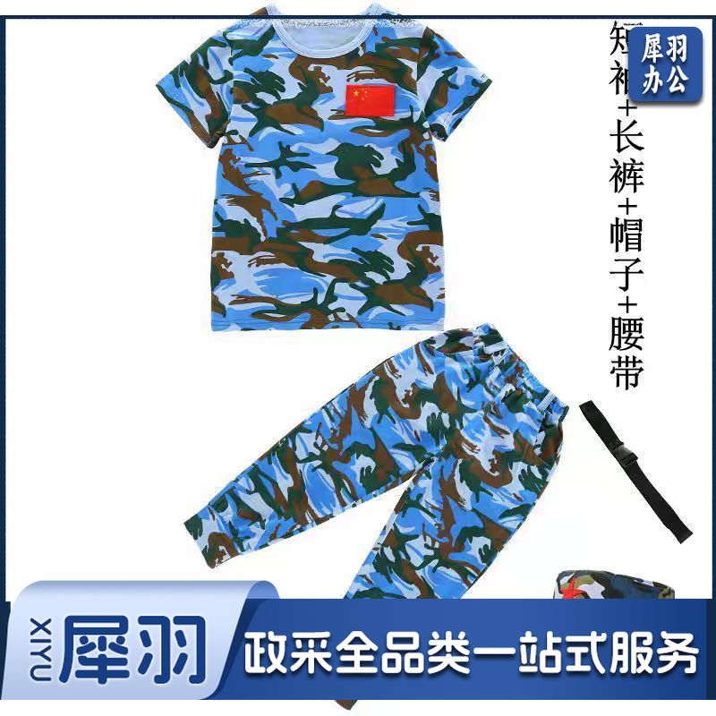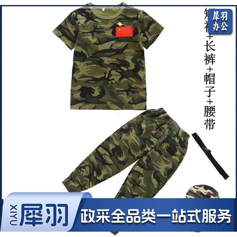 儿童迷彩服套装短袖T恤小学生幼儿园演出服研学夏令营服装军训服套装+帽子+腰带