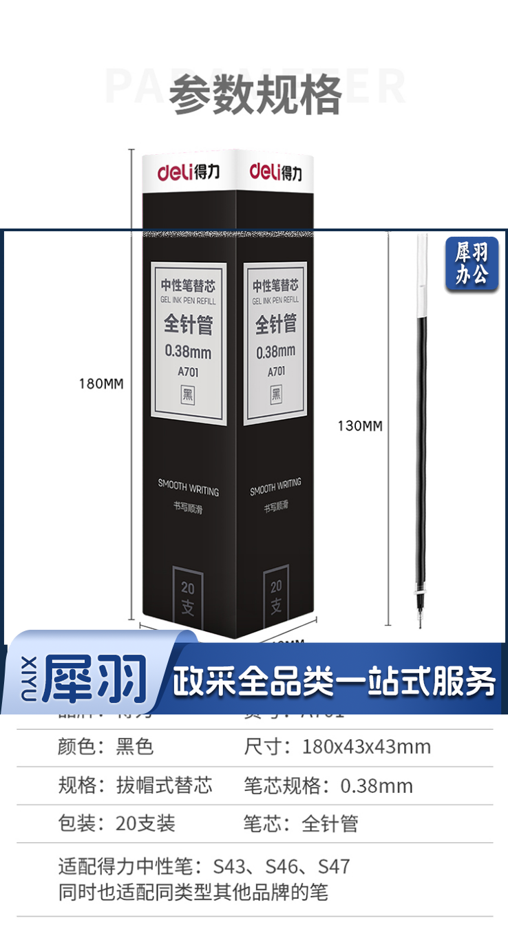 得力A701学生中性替芯0.38mm全针管(黑)