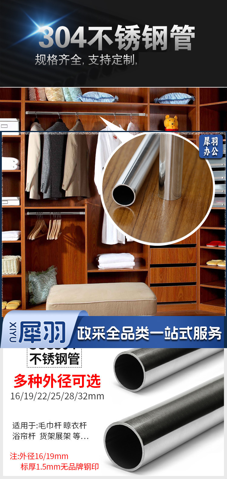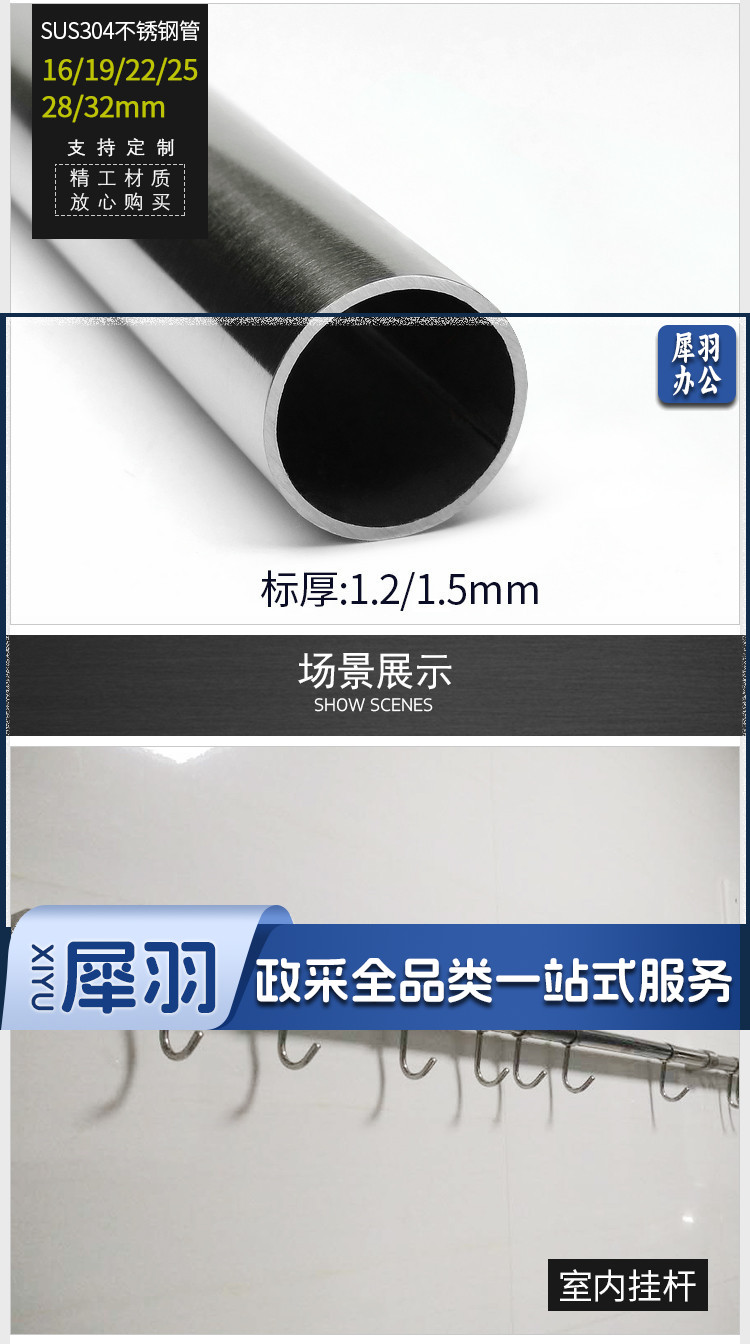 304不锈钢管 晾衣杆 衣柜挂衣通厨房毛巾杆 490*19*1.0mm