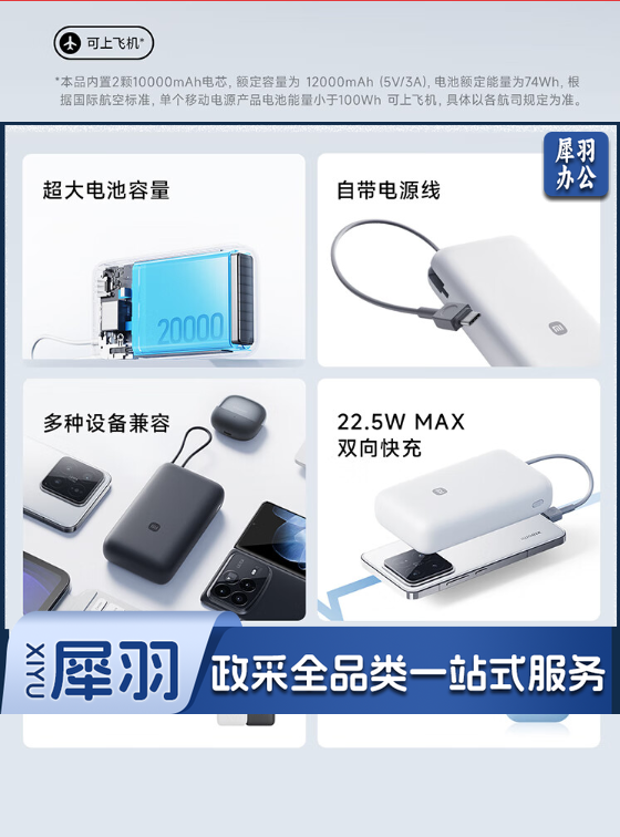 小米(MI)小米自带线充电宝 20000 22.5W 浅灰 可上飞机 多彩便携 有线无线自在充电 iPhone安卓可用