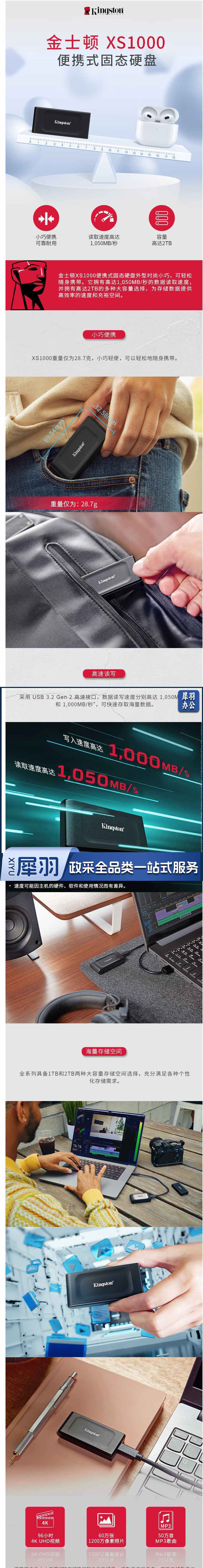 金士顿(Kingston)1TB USB3.2 Gen 2 移动固态硬盘(PSSD)XS1000 传输速度1050MB/s