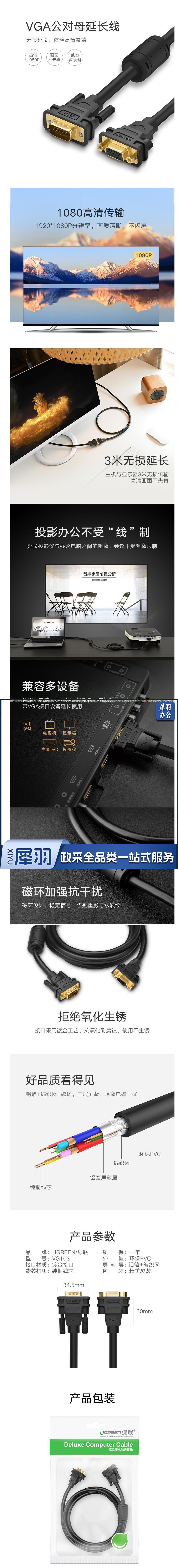 绿联 2米30744 VGA延长线 3+6 工程级VGA公对母高清连接线 电脑显示器视频加长线